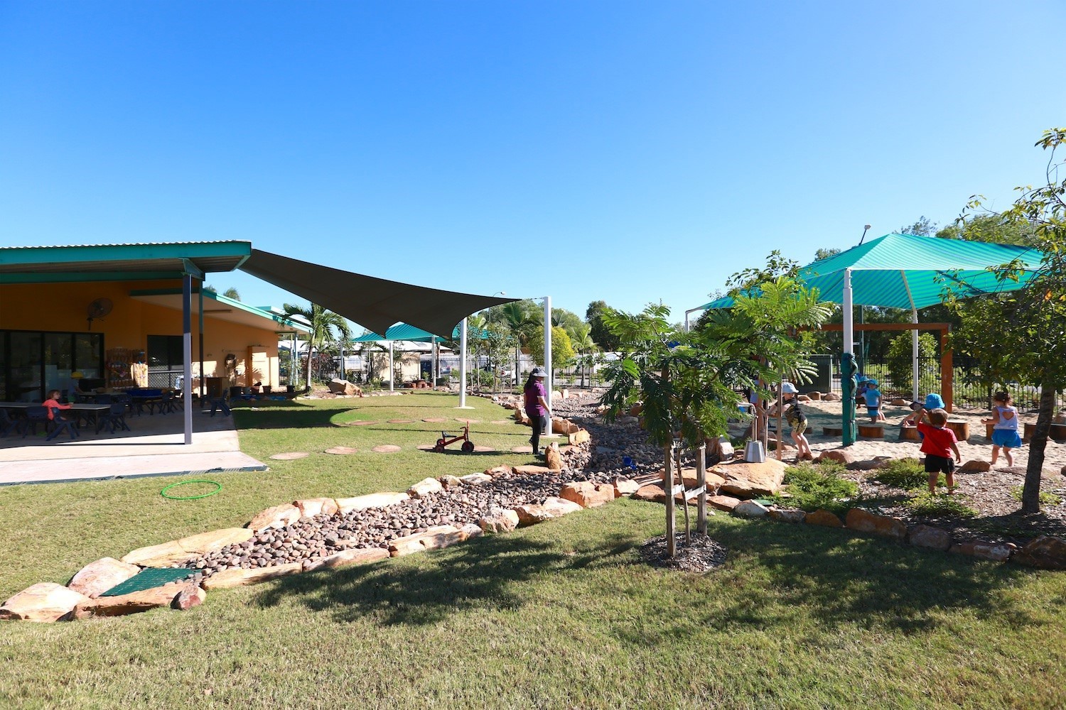 Outside, we have age appropriate play spaces and equipment, all geared to enhance the children’s awareness of their surrounds and the greater environment, as well as their understanding of the importance of sustainability. Our large natural outdoor yard includes a river bed rock pool, bike track, sandpit and swing area. Our play areas are inviting and fun with lots of shade to help beat the summer heat! Given our climate, we can enjoy the outdoors all year around.