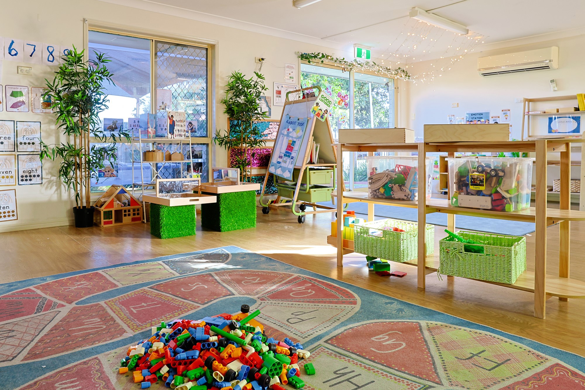 Outside, our playground areas are a balance of natural elements and play surfaces – with sandpits, dry creek beds, Yaggera garden, construction area, climbing wall, bush hut, chicken coop, and ample natural shade.