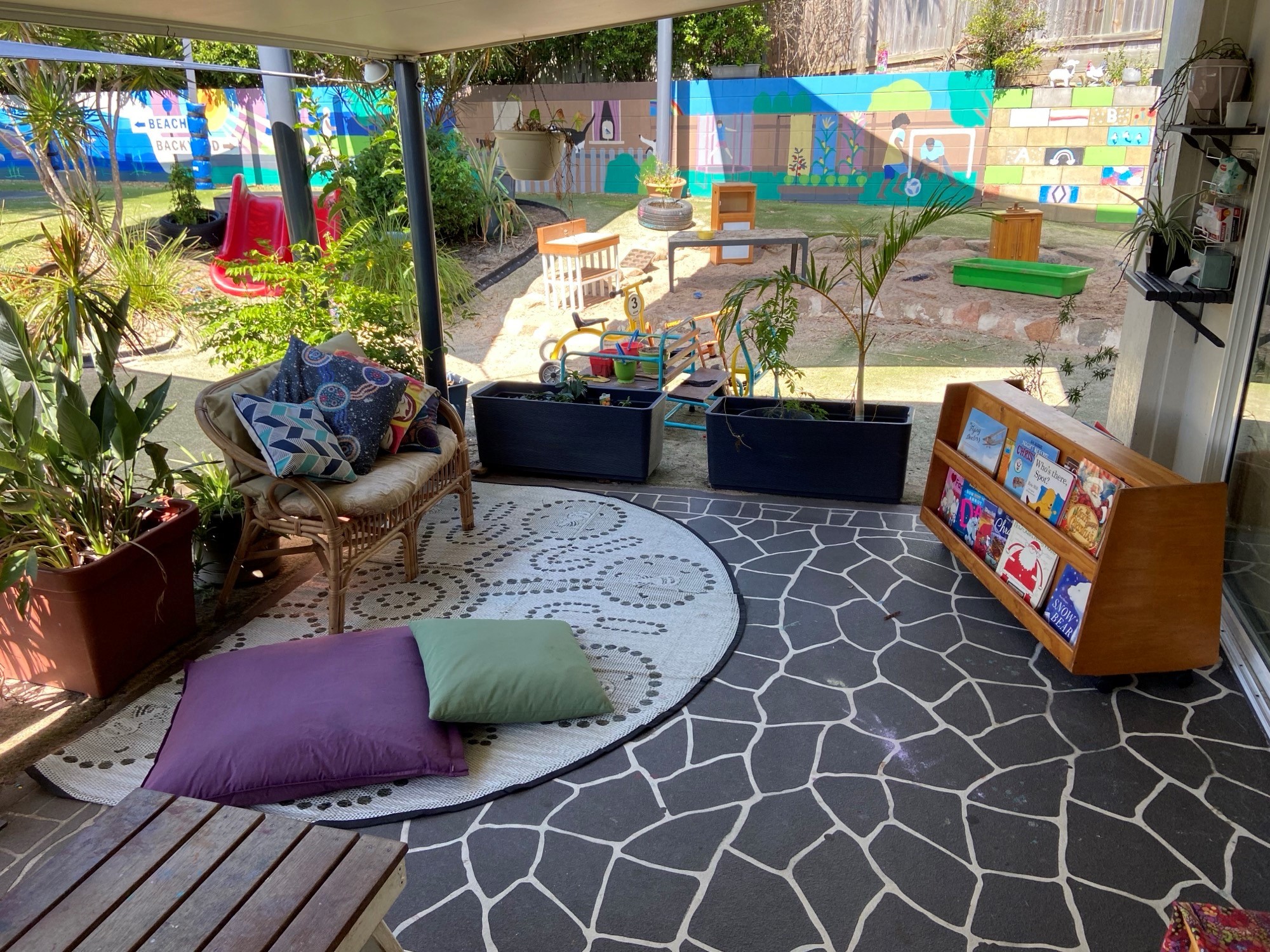 Outside, our playground areas are a balance of natural and manmade elements and play surfaces – with swings, slides, sandpits, talking circle, fort, gardens, boat, vege patch, three worm farms and lots of shade.. We have carefully designed and planned spaces to encourage a stronger understanding of the environment and sustainability – while giving children the scope to explore, play and let their imaginations roam.