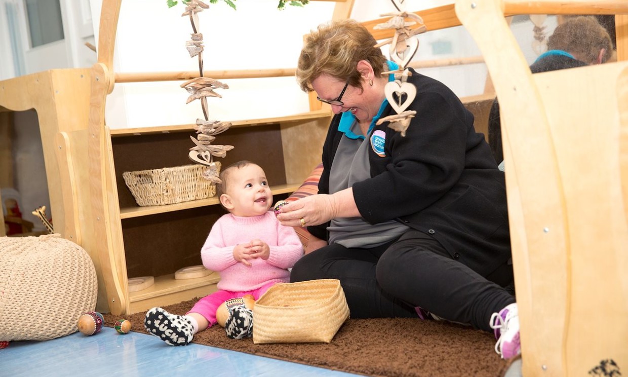 Educators playing peek-a-boo at nappy change time to help babies learn that people and objects continue to exist, even when they can’t see, hear or touch it.